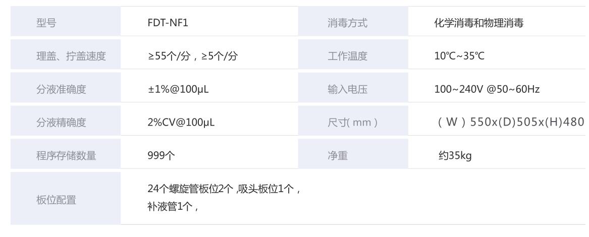 FDT-NF1是一款小巧靈活的桌面型自動(dòng)擰蓋分液系統(tǒng)。即可采用 移液吸頭的方式進(jìn)行移液,也可采用蠕動(dòng)泵的方式進(jìn)行多次分液, 配備全自動(dòng)來(lái)蓋,高扭矩開(kāi)蓋模塊及異常檢測(cè)模塊,保證持續(xù)穩(wěn)定的工作;支持用戶自定義耗材導(dǎo)入,兼容各類常見(jiàn)的螺紋蓋試管,實(shí)