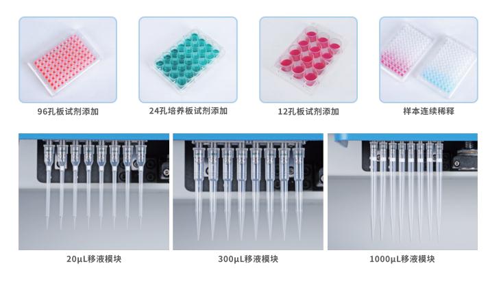 8道多功能移液工作站可實現(xiàn)從單個試管加至各種6孔板、12孔板、24孔板、48孔板、96孔板以及試管到試管的移液,適配各個廠家的培養(yǎng)板、PCR板、深孔提取板、凍存管等容器。真正做到靈活性與操作簡便性與一體。