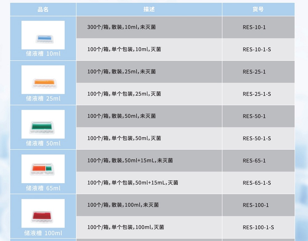 ③ 儲液槽(試劑槽)(10mL、25mL、50mL、50mL、100mL五種規(guī)格任選)1箱;