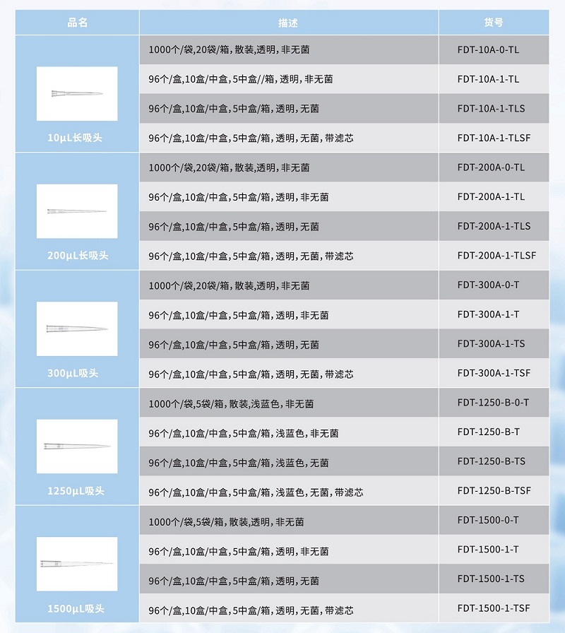 ② 盒裝濾芯吸頭96個*50盒/箱(10μL加長、300μL、1250μL三種規(guī)格任選)1箱;