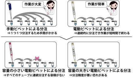 ? 在反復(fù)多次分液作業(yè)的情況下(這次實(shí)驗(yàn)為連續(xù)11次),電動(dòng)移液器與手動(dòng)移液器相比,能夠?qū)⒉僮鲿r(shí)間縮短2/3-1/2左右。