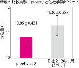 圖2. 分注精度的比較:pipetty電動(dòng)移液器1-250 μL 和手動(dòng)移液器 2-20 μL (E 公司) 將蒸餾水 11 μL 吸取-分注,重復(fù)分注 11,考察平均值和偏差(SD)。