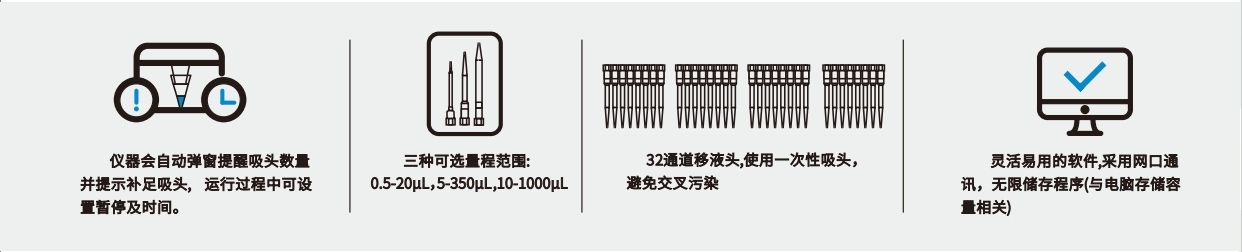 ● 支持吸頭左、右靠壁模式以及靠壁距離設(shè)定,適應(yīng)各種試管及微孔板,吸頭可丟棄到廢棄盒,也可以打回原吸頭盒;